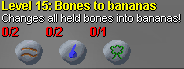 Bones to bananas is a level 15 magic spell that turns all bones in your inventory to bananas. This is useful when you are low on Hits and do not have much food. Bones to bananas costs 2 Earth-Runes, 2 Water-Runes, and 1 Nature-Rune.