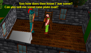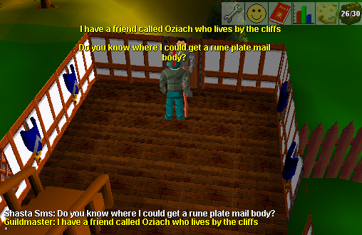 Once you arrive at Oziach's house, ask him if you can purchase a Rune Plate Mail Body and he say that you must to first prove yourself as a hero to earn the right. To prove yourself, he wants you to kill the dragon named Elvarg on Crandor.