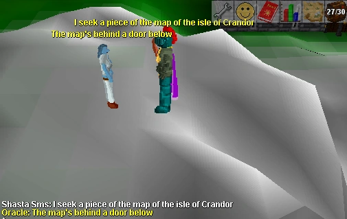 Go to the top of the mountain and speak with the Oracle. Tell her you seek a piece of a map of Crandor and she will give you a riddle: