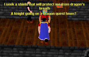 All that is left to do now is kill Elvarg. Make sure to pick up an Anti dragon breath Shield from the Duke of Lumbridge, found on the upper floor of the castle in Lumbridge. You should bring the best armour and one-handedweapon you can use, along with the anti dragon breath shield, though you may bring another shield as well as you will be near aggressive mid-to-high level monsters. Any extra spaces in your inventory should be filled with lots of food and any potions or runes you would like to use. Some players choose to cast spells with magic while fighting with melee. Teleportrunes are recommended if you want to avoid walking past skeletons and several Lesser Demons after the fight.