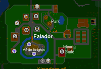 Falador is a large city in RuneScape Classic. It is the capital of Asgarnia, and is led by the White Knights. It is protected by several guards, has two banks, a park and it is also home to the Mining Guild and the White Knights Castle.