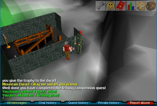 A few of seconds later, the contest will end and you will be given the Hemenster fishing trophy for winning. Go back to either of the two mountain dwarves to complete the quest.