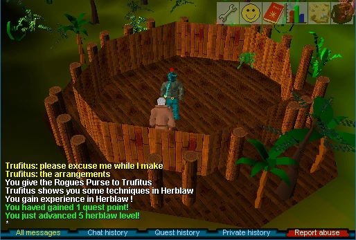 Trufitus will tell you to find Rogues Purse. The herb is in the Jogre dungeon, north-east along the coast. Climb down the ladder there and enter the cave.On the far east wall, search a cavern wall with green spots (fungus covered wall) to find the herb. Clean the herb. (The Jogres can drop Rogues Purse, but Trufitus will not accept one of these). To exit the dungeon, climb up the rocks where you entered it.