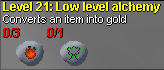 Low-level alchemy is a conversion spell available at level 21 Magic that converts an item into coins, usually the value when sold to a General Store. It costs 3 fire and 1 nature rune to use, and yields 62 experience per successful cast.