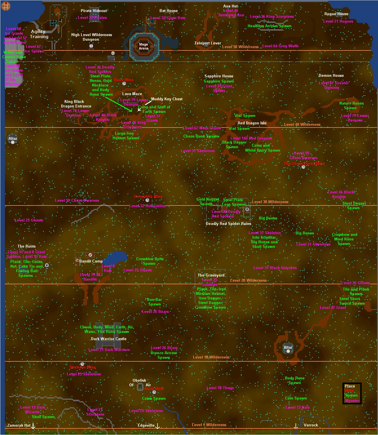 The Wilderness border can be crossed on foot from northern regions of Misthalin and Asgarnia. The border areas are: Chaos Temple and Goblin Village, Black Knights' Fortress, Edgeville, northern Varrock and Lumber Mill. Edgeville is the most used location due to very close bank and direct teleport there via Charged Dragonstone Amulet.
