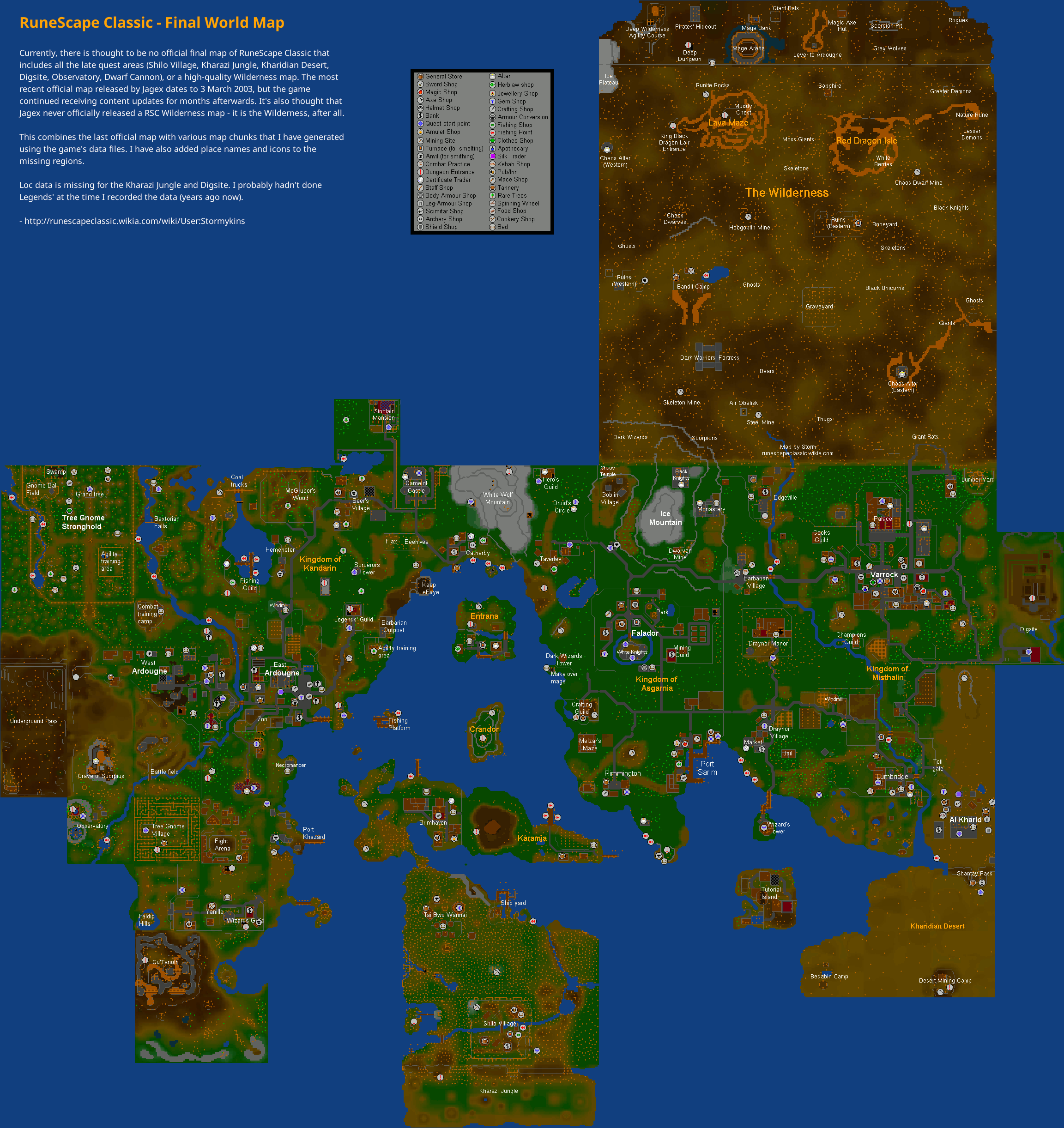 - The Kharidian Desert, Digsite, Shilo Village, Khazari Jungle, Gu'Tanoth, Observatory, and the Sinclair Mansion areas were never revealed on the official RSC map.